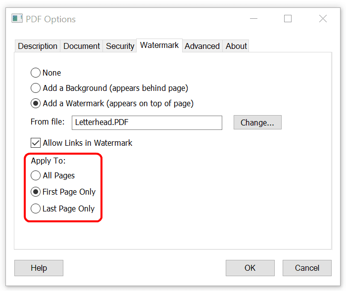 If you only want to apply the watermark or background to the first or last page, you can select the "First Page Only" or "Last Page Only" options in the "Apply To:" setting: